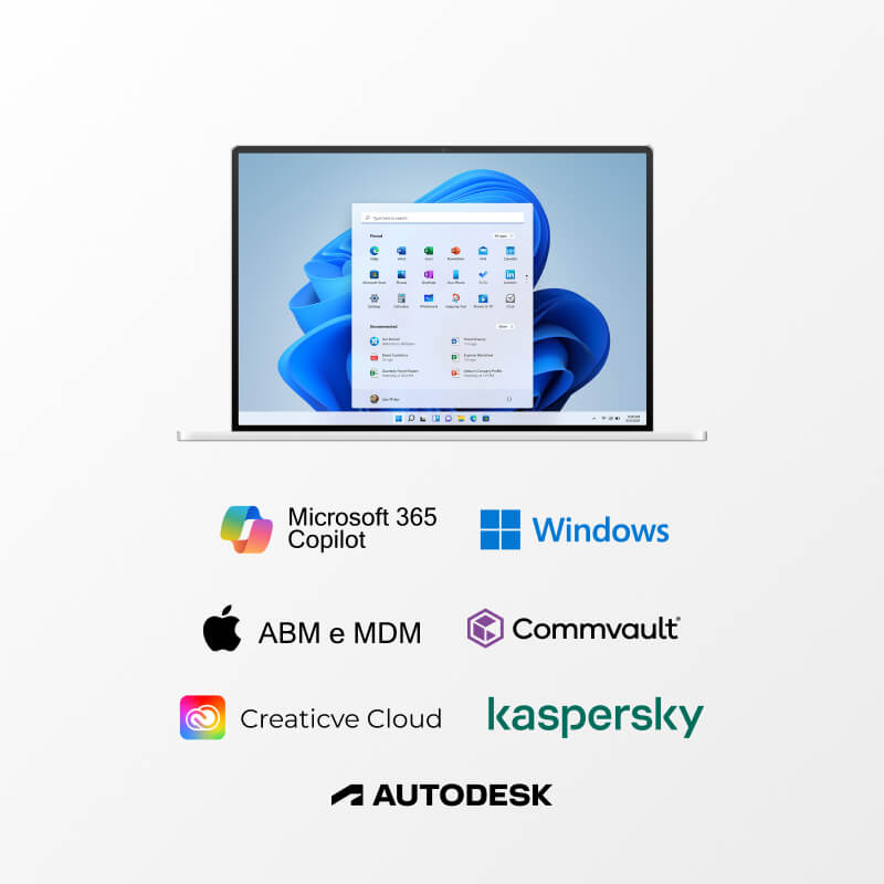 Aplicativos como Microsoft 365 Copilot Business, soluções de backup como Commvault, antivírus e Adobe Creative Cloud para produtividade e proteção de dados, com segurança e funcionalidades que impulsionam a eficiência.